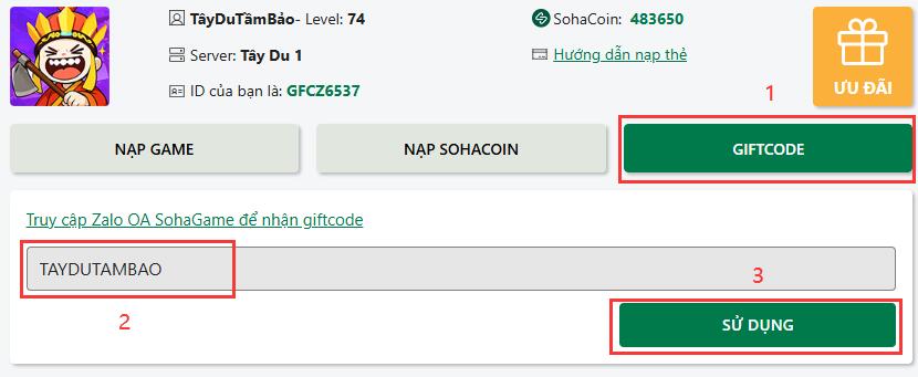 Bước 3: Bấm vào mục "GIFTCODE" > Nhập mã quà tặng > Bấm Sử Dụng