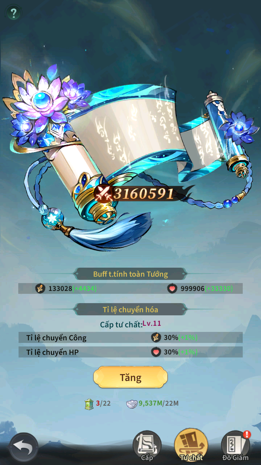 Sử dụng Thiên Thư Ấn tăng cấp thư chất Thiên Thư. Tư chất Thiên Thư càng cao, tỷ lệ chuyển đổi buff thuộc tính Thiên Thư toàn trận cho Tướng càng lớn.