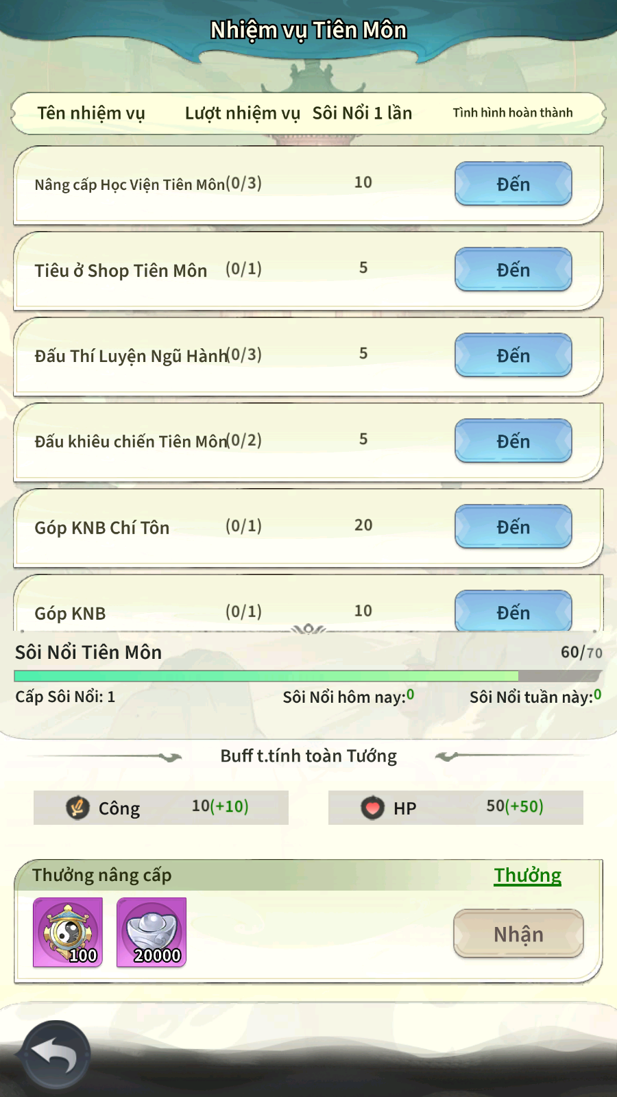 Các Thượng Tiên có thể hoàn thành các nhiệm vụ Tiên Môn để tăng Cấp Sôi Nổi, tăng thêm chỉ số thuộc tính cho toàn bộ