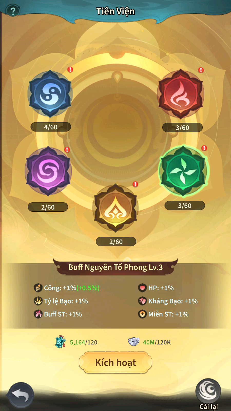 - Kích hoạt Tiên Viện mỗi hệ 6 lượt sẽ tới giai đoạn mốc nâng cấp tiếp theo.