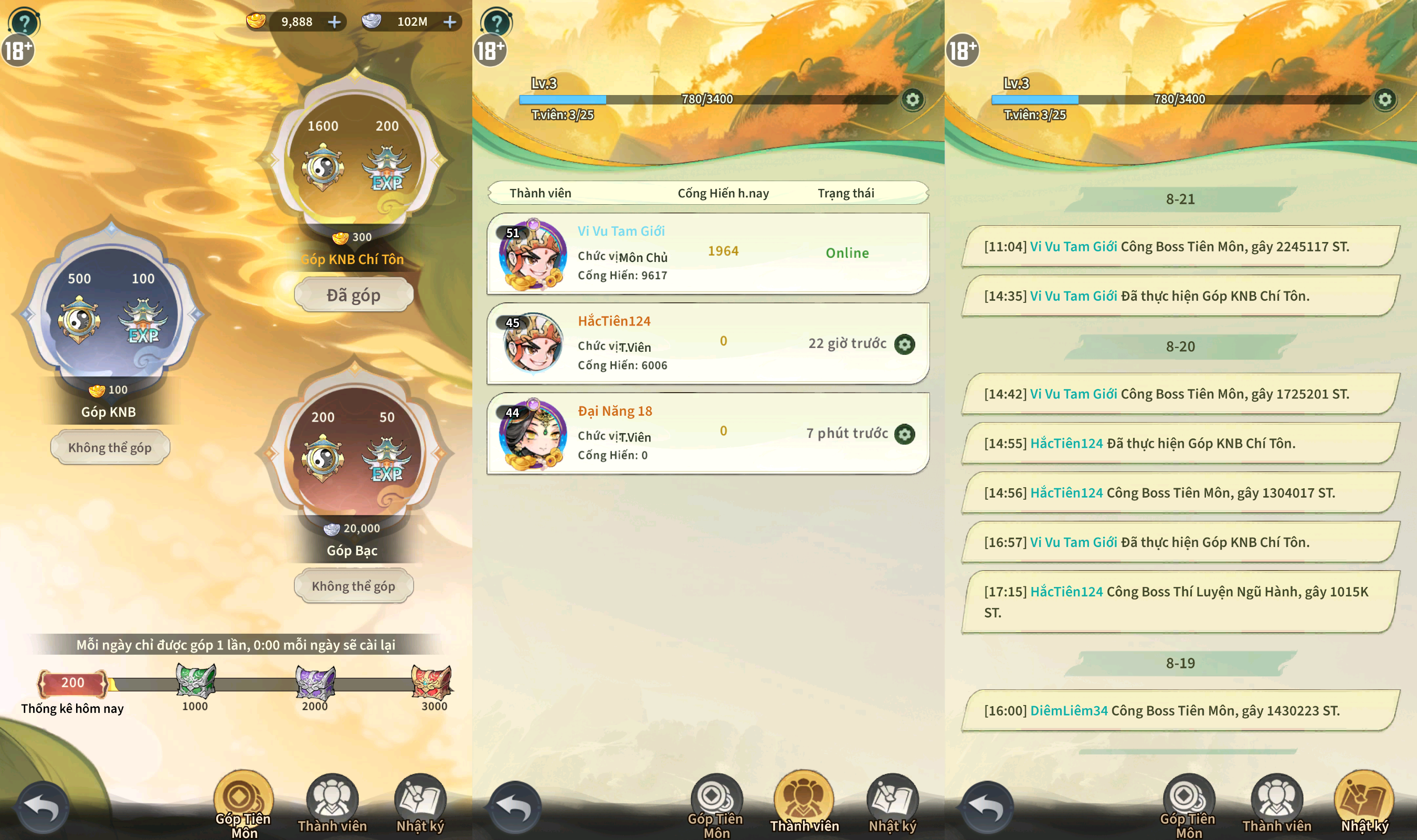 - Toàn thành viên Tiên Môn chỉ được góp 1 lần mỗi ngày, làm mới vào lúc 00:00.